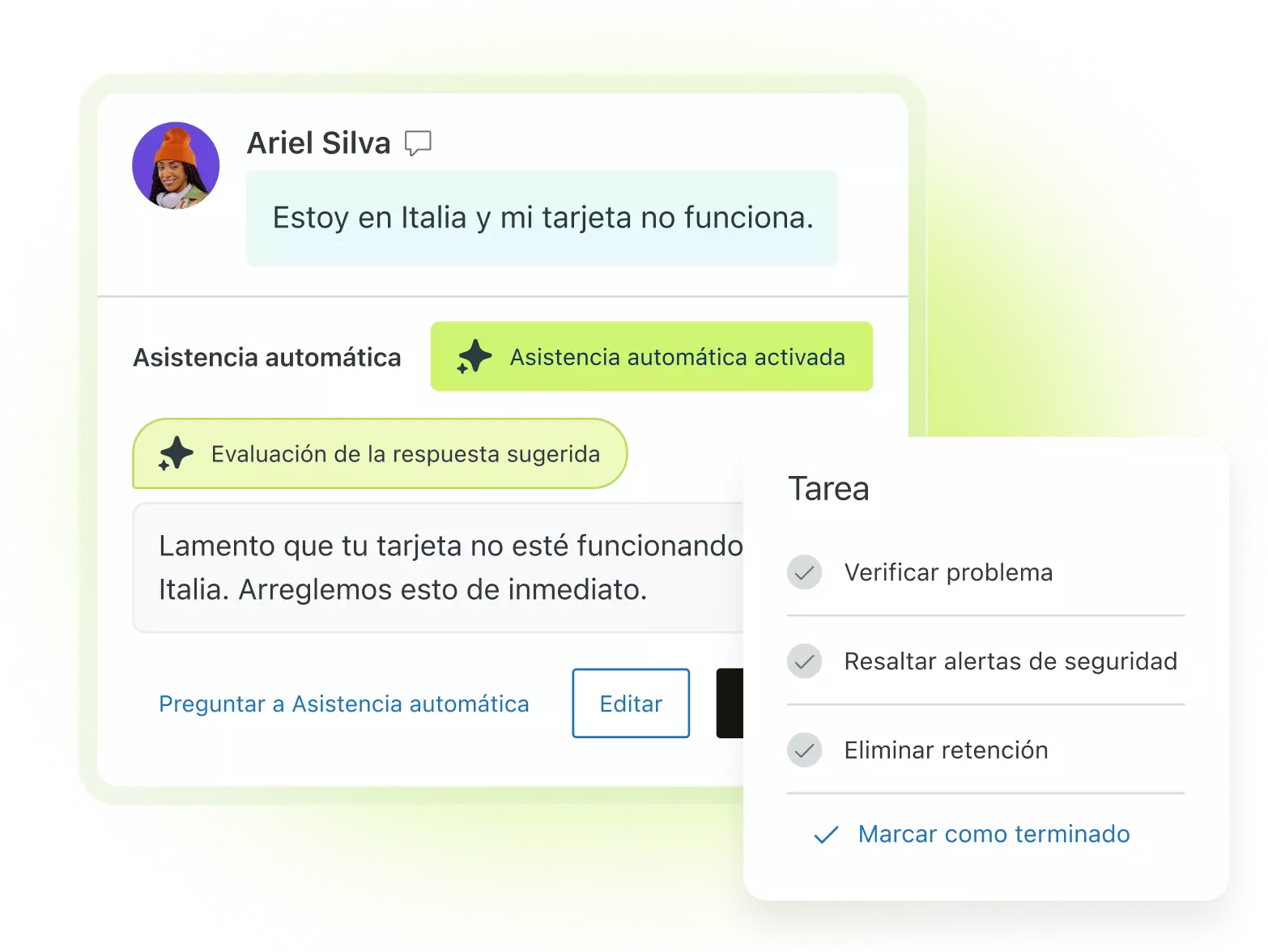 Gestiona al instante las consultas de rutina (como las actualizaciones de cuenta o la información sobre las políticas) y pon a los agentes a atender las conversaciones complejas y transcendentes.