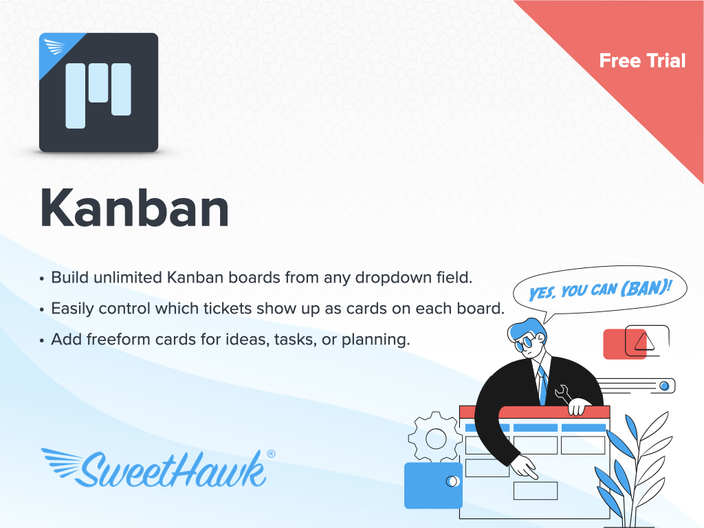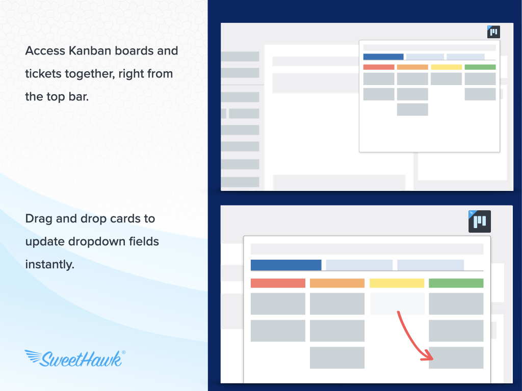 SweetHawk’s Kanban app transforms your Zendesk tickets into clear, visual boards that help teams stay organized and focused. Build unlimited Kanban boards and define your workflow using any Zendesk dropdown field — turning complex queues into a drag-and-drop experience that keeps everyone aligned.