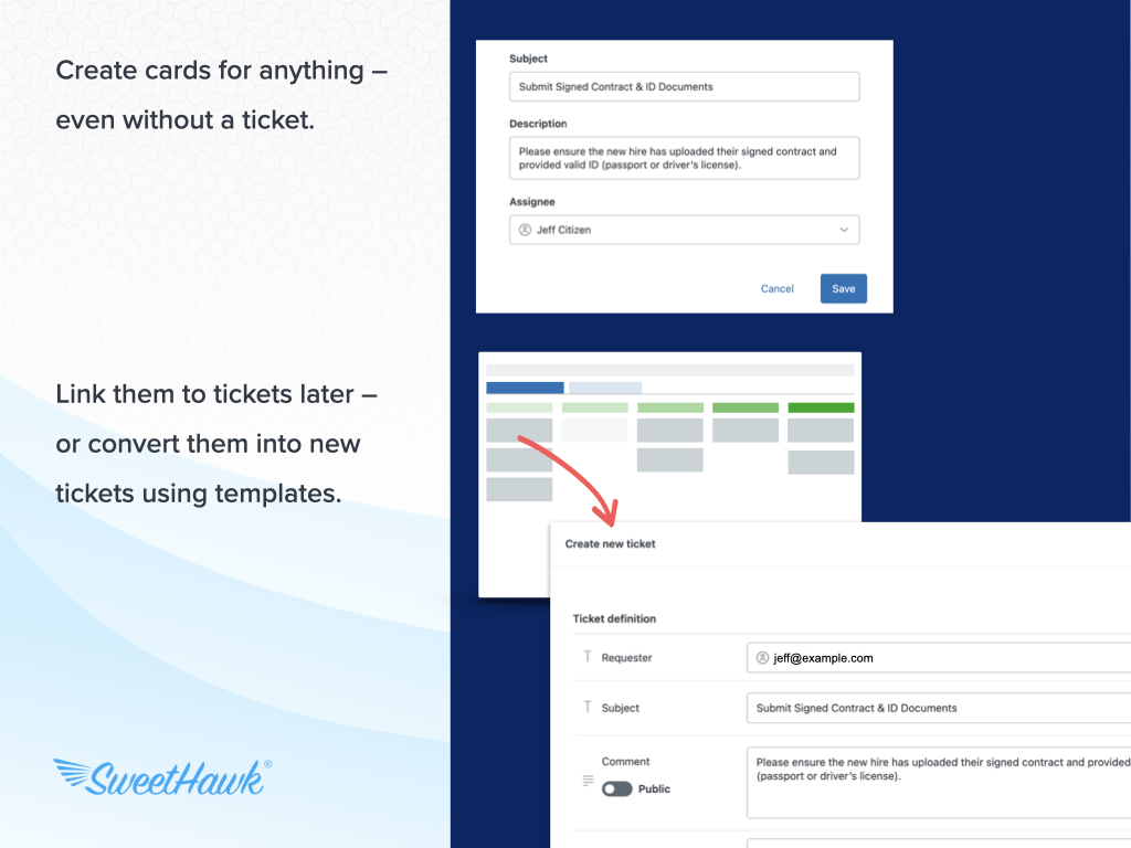 • Convert ideas into action – link cards to existing tickets later or create new tickets directly from templates.