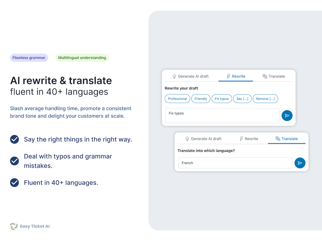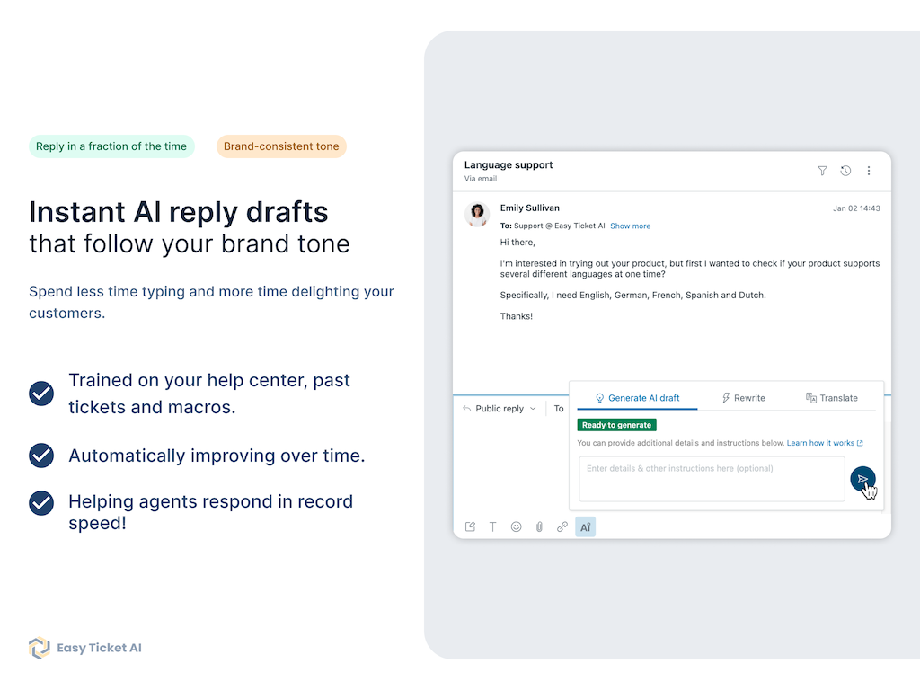 Easy Ticket AI automatically trains on your help articles and documentation. It also picks up your on-brand tone, language and formatting from your macros and past tickets. And it easily handles 40+ supported languages.